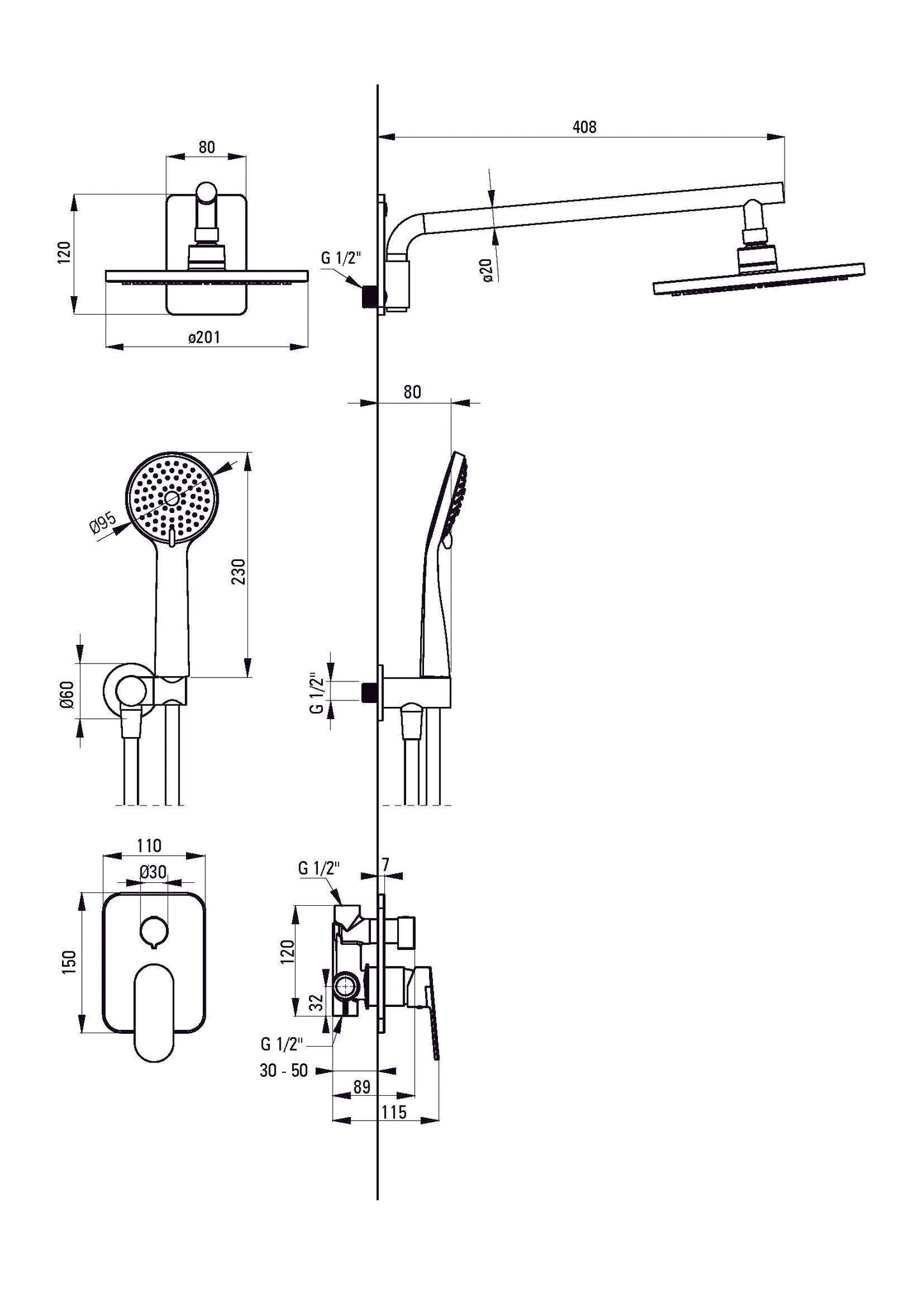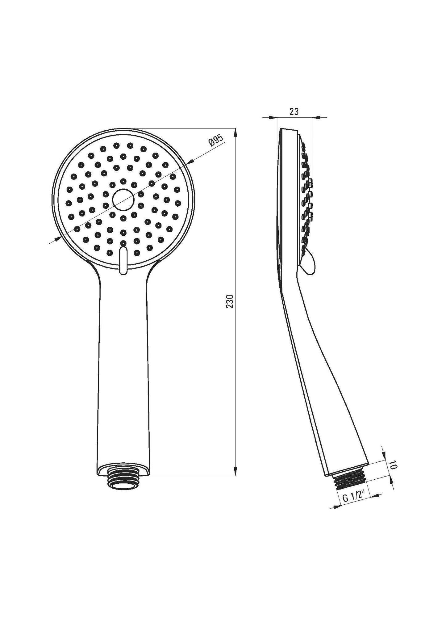 The concealed shower set in matte black is the perfect solution for minimalist and stylish bathrooms. It consists of a round overhead shower, a corner connection with an adjustable hand shower holder, a 3-function hand shower, and a concealed faucet from the Alpinia collection. The hand shower features an anti-calc system to prevent limescale buildup and facilitate cleaning. Made of brass, the concealed faucet features a discreet design and a functional diverter that allows for convenient water flow adjustment. The set combines modern design with the highest quality.