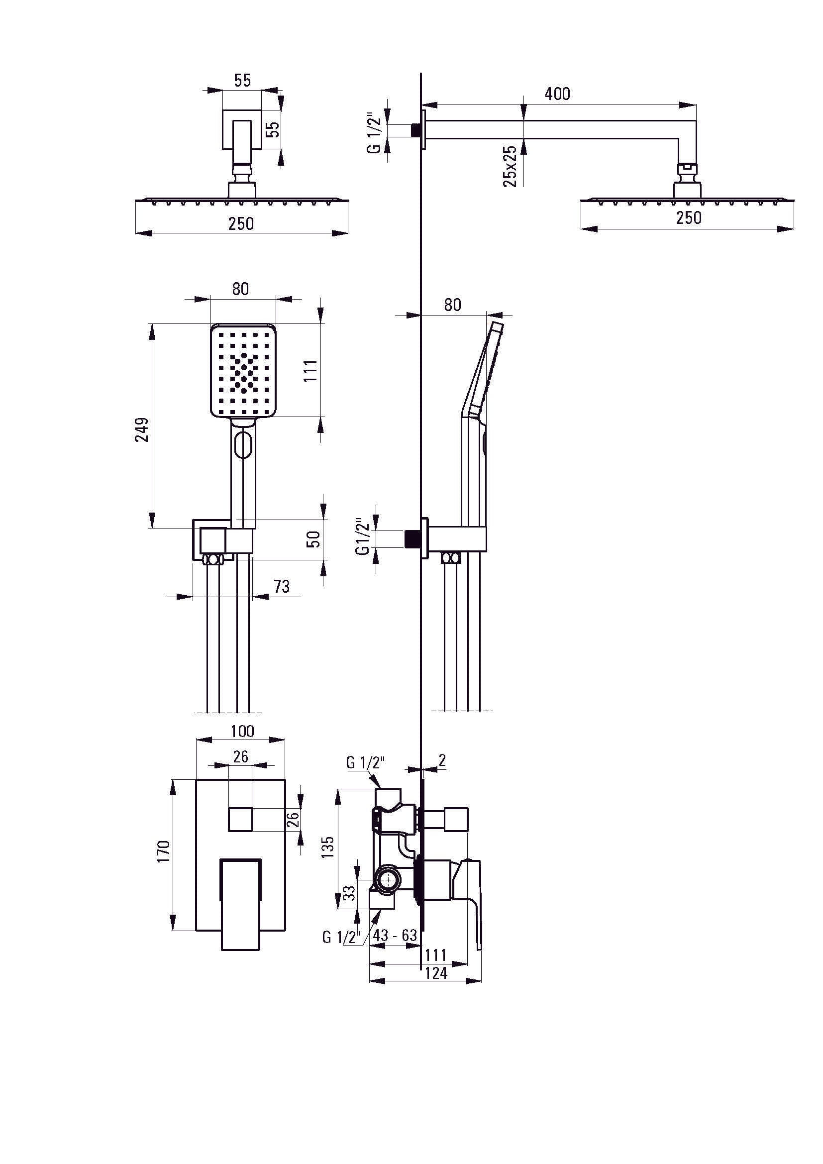 This concealed shower set in polished chrome is part of the Anemon Bis collection. The collection's key features are balanced proportions, striking lines, and a cubist shape. The set includes a mixer tap, a hand shower, a hand shower holder, a PVC hose, and a shower head. The mixer tap features a mechanical shower diverter that allows you to switch the water source between the hand shower and the shower head. The hand shower offers three spray modes: rain, mist, and a combination of both. The large square shower head is made of brass and features an anti-calc system that facilitates the removal of deposits and limescale.