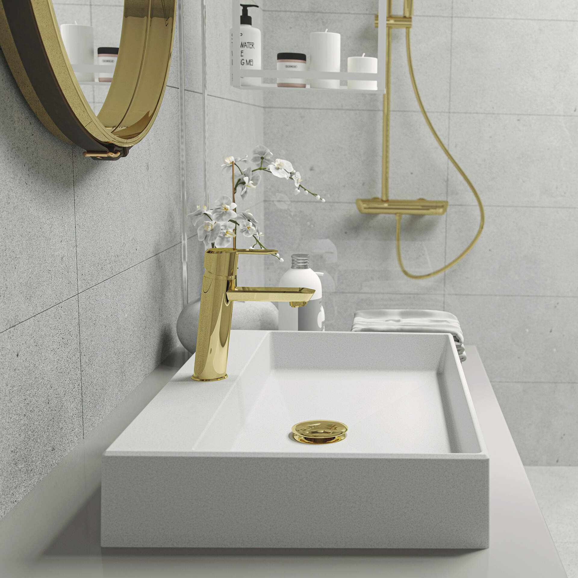 The Arnika collection basin faucet, with its extravagant gold finish, captivates with its harmonious shape and rounded form. The gently sloping body and cylindrical cross-section are eye-catching. The faucet features a silicone fan to aerate the water and an anti-calc system for easy cleaning. The Arnika collection is an original faucet series inspired by the Danish concept of hyggelig happiness, allowing users to enjoy a relaxing and pampering bath in their own home.