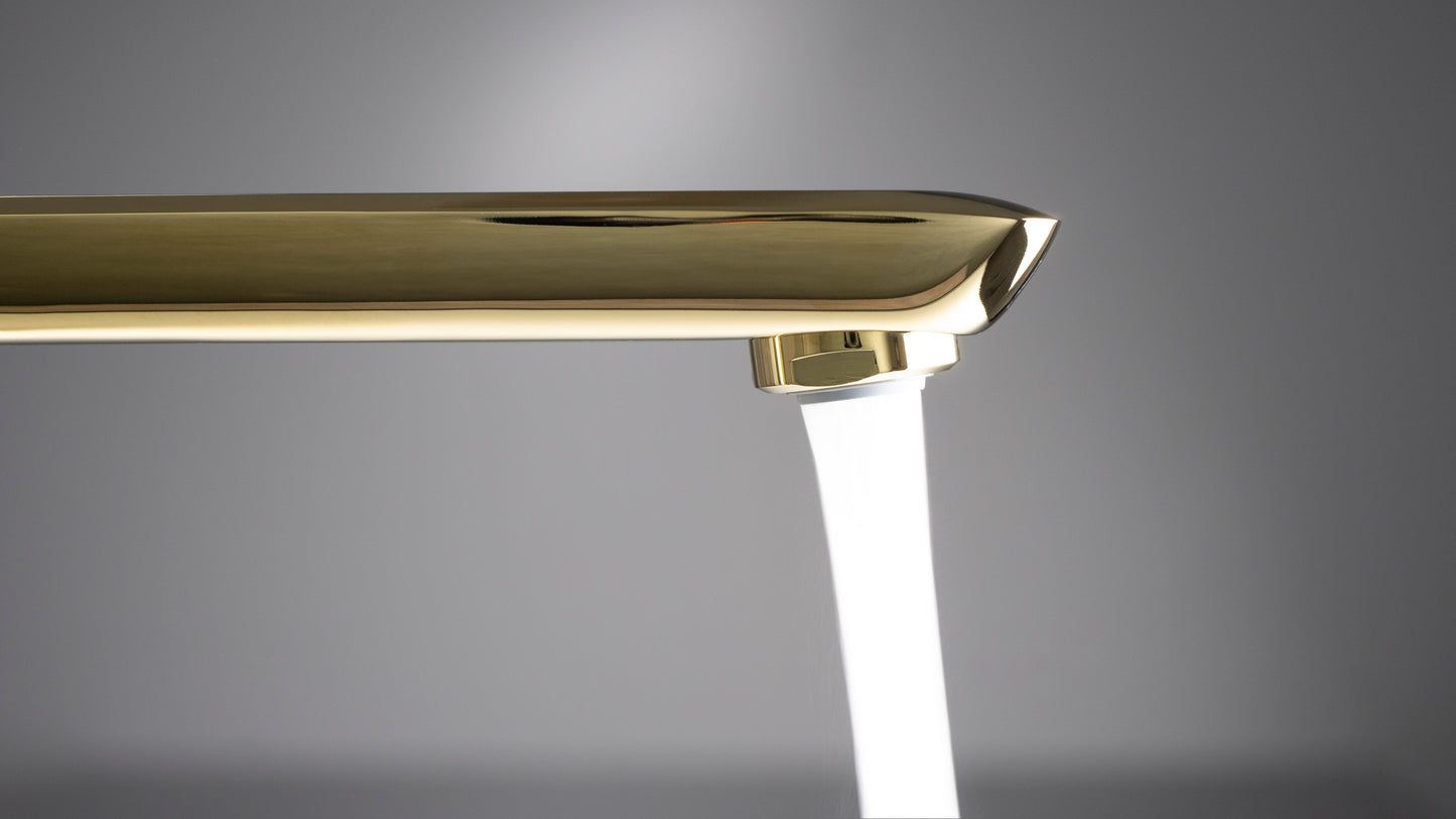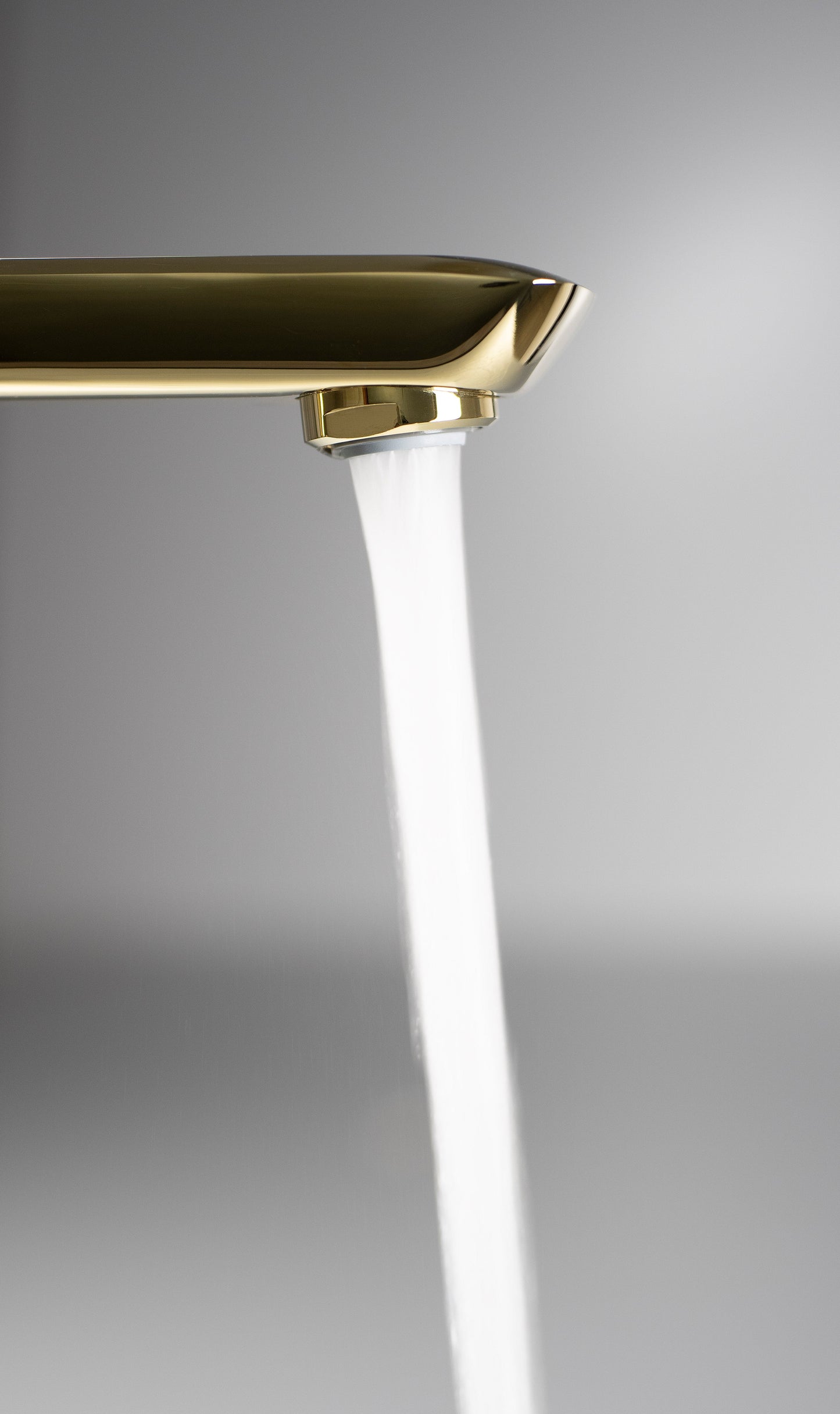The modern basin faucet from the Arnika collection features a raised body and a striking gold finish. It is designed for countertop washbasins. The rounded lines and harmonious shape add a touch of class to any bathroom. The faucet features a silicone aerator with an anti-limescale function, which is easy to clean and effectively reduces water consumption.