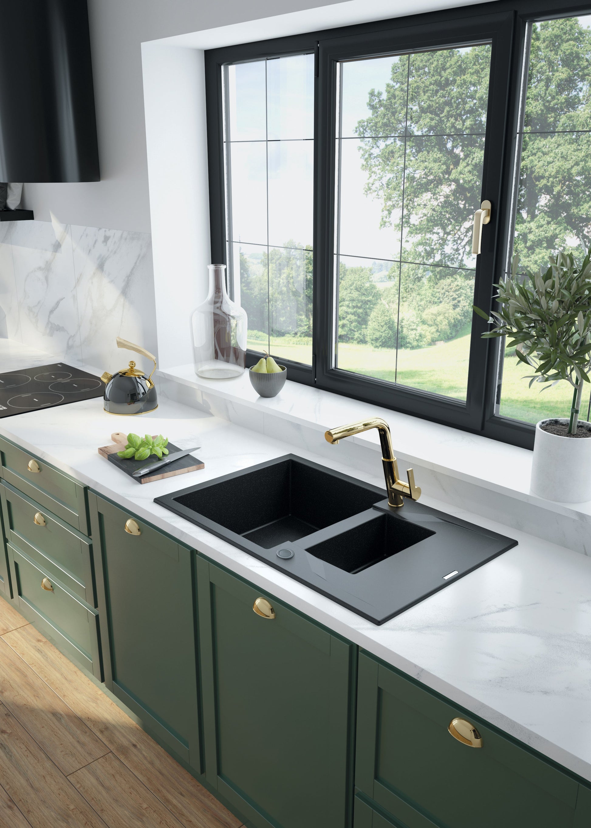 Granitverbund ist eine Kombination aus Quarzsand und Harzen in genau abgemessenen Verhältnissen. Dies ist der Grund, warum unsere Spülen nicht nur stoßfest, sondern auch beständig gegen hohe Temperaturen (bis zu 250°C), Verfärbungen und Temperaturschocks sind – gemäß der europäischen Norm PN-EN 13310. Sie nehmen keine Gerüche auf und weisen dank ihrer hydrophoben Eigenschaften Wasserpartikel ab. Granit ist edel und zeitlos, und dank der breiten Farbpalette harmoniert er sowohl mit moderner als auch klassischer Kücheneinrichtung. Die Granitspülen der Marke Deante werden in Polen in einer der modernsten Fabriken Europas hergestellt. Die fortschrittliche Produktionstechnologie gewährleistet höchste Verarbeitungsstandards und eine strenge Qualitätskontrolle, was nicht nur ein exzellentes Erscheinungsbild, sondern auch außergewöhnliche Eigenschaften des Produkts garantiert.