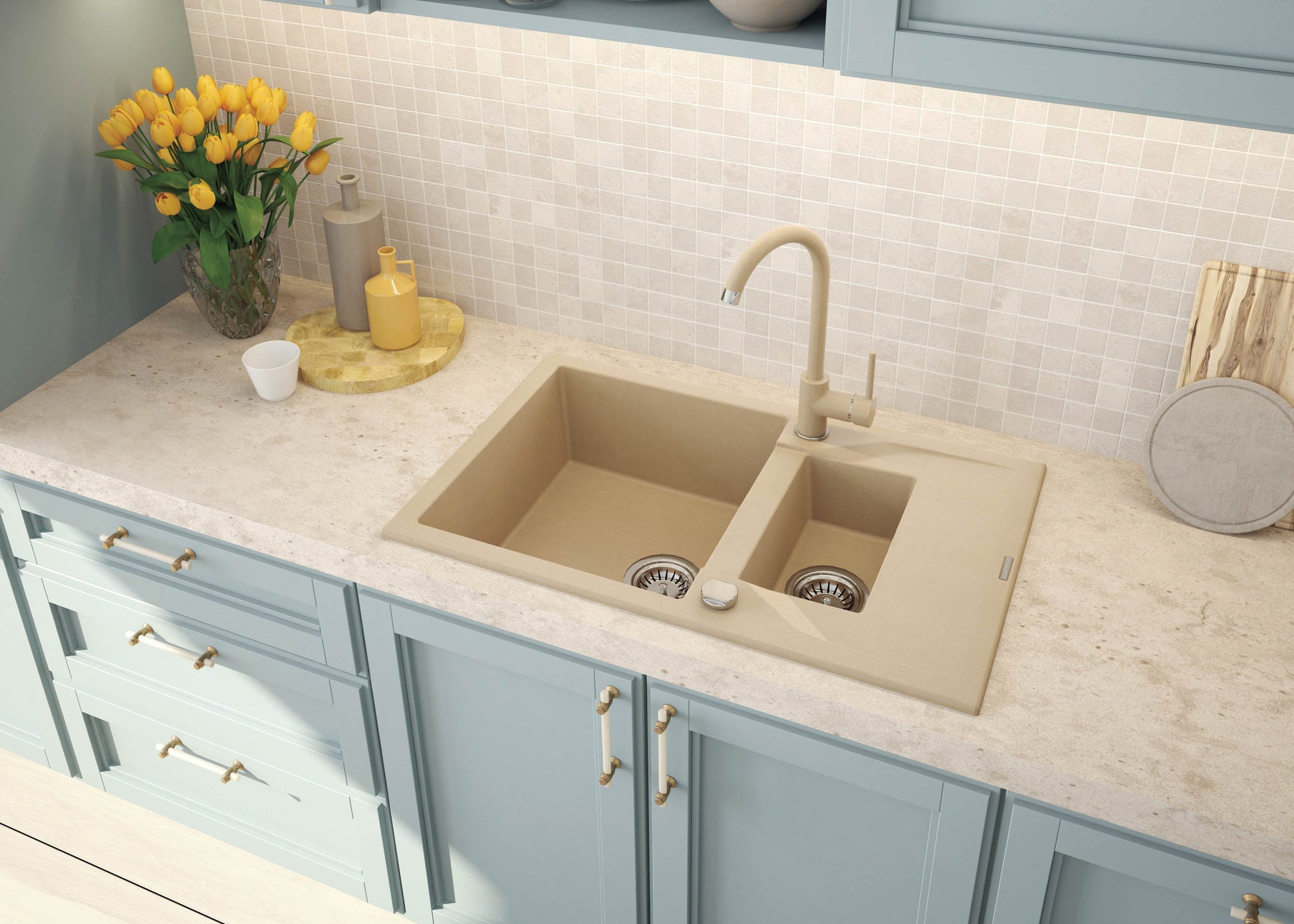 Das 1,5-Becken-Graniteinbauspülbecken Andante mit einem geräumigen Hauptbecken, einem kleineren rechteckigen Becken und einer Abtropffläche ist ein Produkt, das modernes Design mit hochwertigsten Materialien kombiniert – einer edlen Granitmischung. Dank des schmalen und niedrigen Randes fügt sich das hier präsentierte Einbauspülbecken Andante in einem sanften, sandfarbenen Ton nahtlos in die Arbeitsplatte ein und bleibt ein dezenter Blickfang, der gleichzeitig eine perfekte Ergänzung für klassische oder von der Natur inspirierte Küchen darstellt. Die Andante-Spülbecken aus der von Micha? ?oj entworfenen Kollektion entsprechen dem Trend der maximalen Raumnutzung in der Küche. Trotz gleicher Außenmaße wie Standardprodukte bieten sie im Inneren deutlich mehr Platz. Die tiefen, erweiterten Becken werden besonders Hobbyköche begeistern und erweisen sich als ideale Lösung für moderne Küchen, in denen Ergonomie und Funktionalität mit Eleganz, zeitlosem Design und hochwertigen Materialien Hand in Hand gehen. Die Spülbecken dieser Kollektion bestehen aus extrem widerstandsfähigem Granit, der sich durch Beständigkeit gegen Verfärbungen, Kratzer, Temperaturschocks, Temperaturen bis zu 250 Grad sowie Stöße auszeichnet. Andante-Spülen verfügen zudem über hydrophobe Eigenschaften, wodurch ihre Oberfläche nicht nur keine Wasserpartikel aufnimmt, sondern sie aktiv abweist – was die Reinigung erheblich erleichtert. Dank der Stärke des Granits, des modernen, minimalistischen Designs, eleganter Farben und des universellen Charakters wurde diese Kollektion mit den Auszeichnungen „Must Have 2016“ und „Diament Meblarstwa 2016“ geehrt.