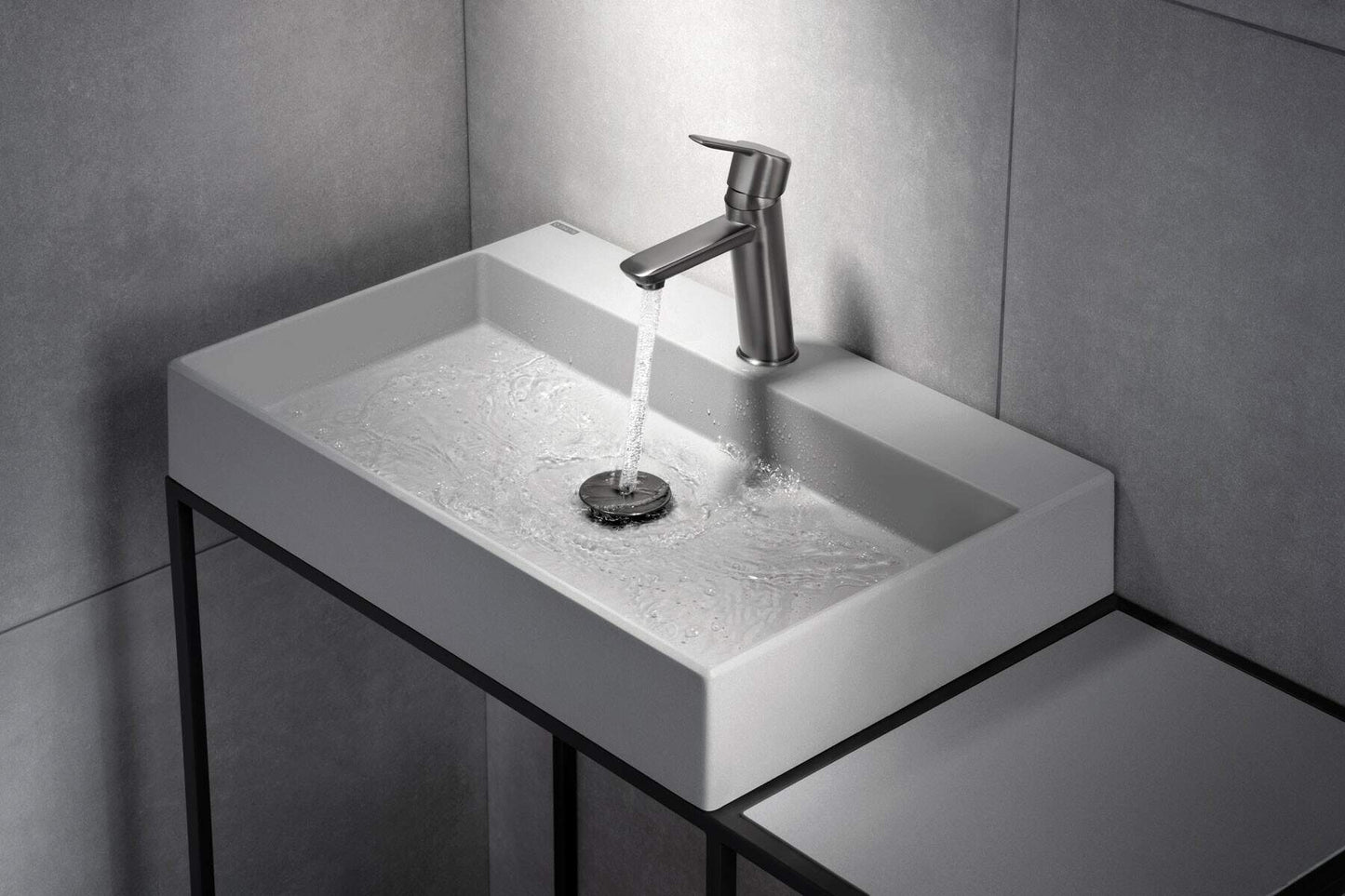 Die Waschtischarmatur aus der Kollektion Arnika Titanium in einem faszinierend eleganten, matten Graphitstahlfarbton, der dem aktuellen Trend zu Erdtönen entspricht, verbindet Farbe mit subtilen, abgerundeten Formen. Das Waschtischmodell zeichnet sich durch seinen sanft geneigten Korpus aus. Der Luftsprudler aus Silikon sorgt für eine perfekte Belüftung des Wassers, wodurch ein angenehmer, voluminöser Wasserstrahl entsteht und Kalkablagerungen leicht entfernt werden können. Die Armatur ist in elegantem Mattschwarz gehalten.
