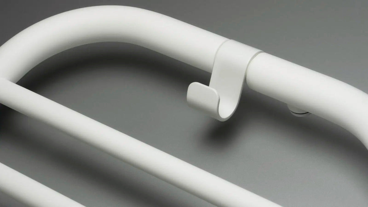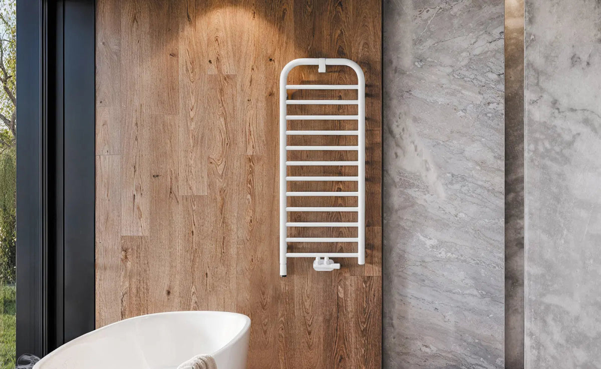 Moderner Badheizkörper im Format 1210 × 500?mm mit abgerundeten Formen und matter weißer Oberfläche. Ausgestattet ist er mit einem praktischen Haken für Handtücher oder einen Bademantel. Es handelt sich um ein Hybridmodell – wasser- und elektrobetrieben –, das mit einer optionalen 400-Watt-Heizpatrone ergänzt werden kann. Diese sorgt außerhalb der Heizperiode für zusätzliche Wärme oder das Trocknen von Handtüchern. Ein passendes Ventil muss separat erworben werden. Sowohl die optionale Heizpatrone als auch das notwendige Ventil sind farblich auf den Heizkörper abgestimmt erhältlich.