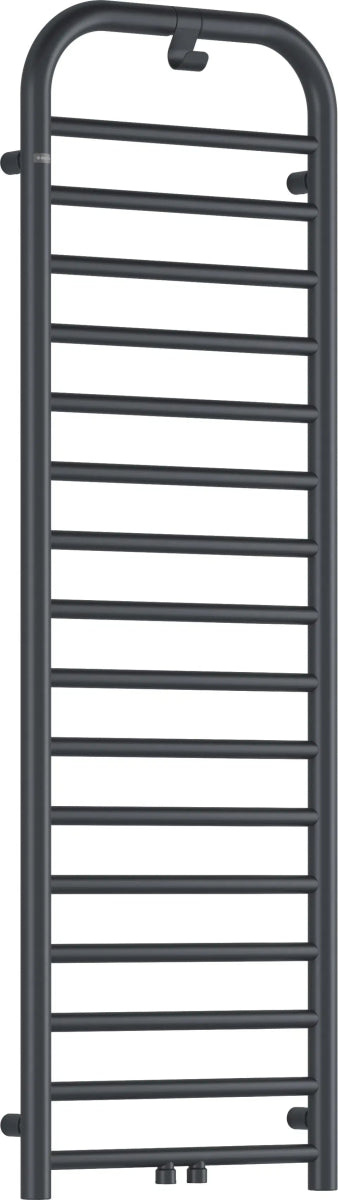 Moderner Badheizkörper in der Farbe Titan matt im Format 1570 × 500?mm – mit abgerundeten Formen und einem charakteristischen Finish. Ausgestattet ist er mit einem praktischen Haken für Handtücher oder einen Bademantel. Es handelt sich um ein Hybridmodell – wasser- und elektrobetrieben –, das den Einbau einer 600-Watt-Heizpatrone ermöglicht. Diese sorgt außerhalb der Heizperiode für zusätzliche Wärme oder das schnelle Trocknen von Handtüchern. Sowohl die optionale Heizpatrone als auch das erforderliche Ventil sind in der gleichen Farbe wie der Heizkörper erhältlich.