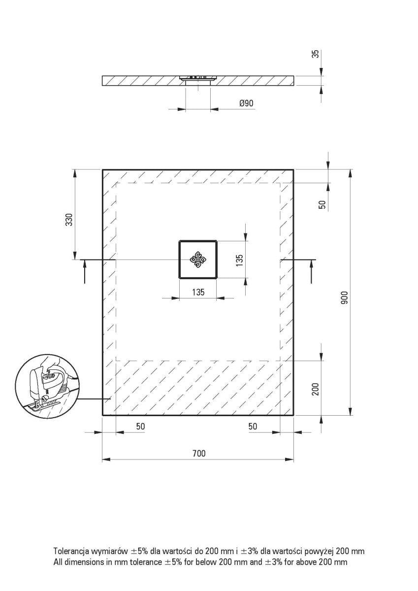 Die Duschwanne wird in der SOLID-PLUS-Technologie gefertigt, die für volle Stabilität, effektive Isolierung und verbesserte Schalldämmung sorgt. Die Möglichkeit, die Duschwanne im markierten Bereich zuzuschneiden, erlaubt eine Anpassung selbst an ungewöhnlich geschnittene Bäder.