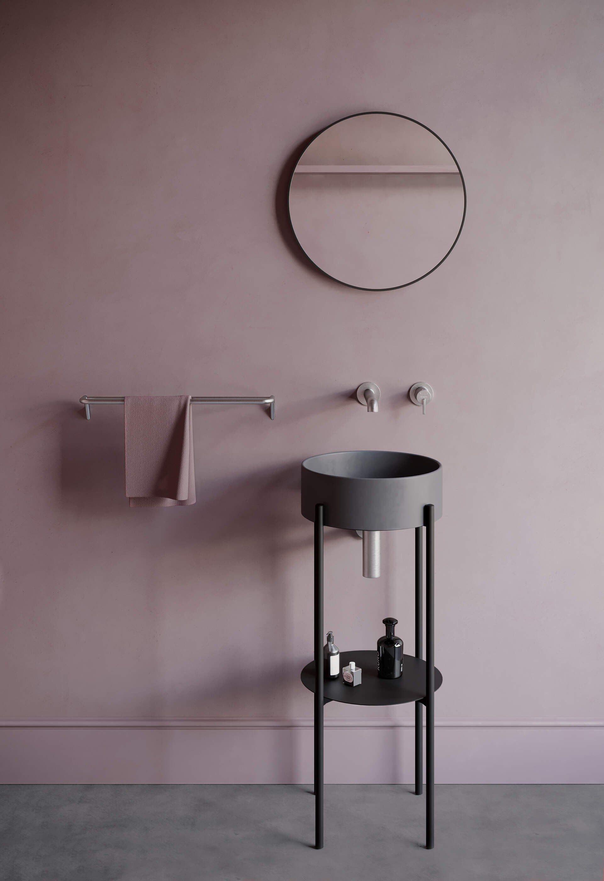 Die Konsole gehört zur umfangreichen Kollektion Silia. Es handelt sich um ein Designmöbel, das für das runde Keramikwaschbecken und die Granitwaschbecken aus derselben Kollektion konzipiert ist. Sie besteht aus hochwertigem Edelstahl und ist mit praktischen Elementen wie einem Regal für Kosmetika und einem Handtuchhaken ausgestattet. Die Konsole kann entweder an der Wand in Kombination mit einer Wand- oder Unterputzarmatur oder freistehend in der Mitte des Badezimmers mit einer freistehenden Standarmatur platziert werden. Hinweis: Die Konsole wird ohne Waschbecken verkauft.