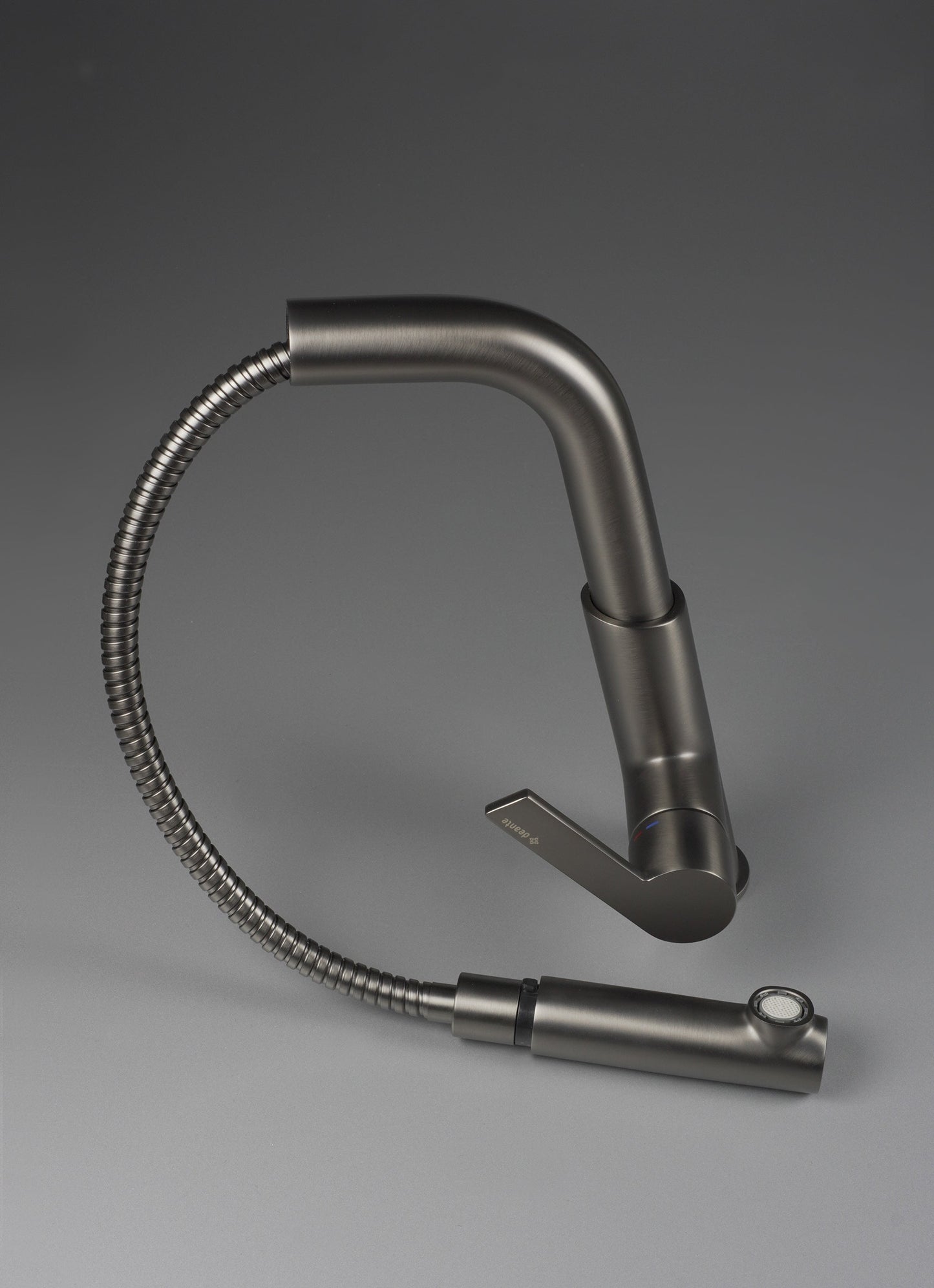 Die Armatur Silia, entworfen von Ewa Wlodarczyk, begeistert mit ihrer dynamischen Form und einem beeindruckenden Finish in Titanium. Sie verfügt über eine praktische, ausziehbare Auslaufbrause, die die Reinigung des Spülbereichs erleichtert und das Befüllen großer Gefäße vereinfacht. Der bewegliche Luftsprudler reichert den Wasserstrahl mit Luft an und reduziert den Wasserverbrauch erheblich.