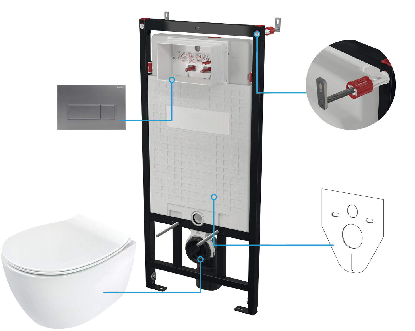 Das 6-in-1-Set aus der Serie Silia ist die ideale Wahl für alle, die in ihrem Badezimmer Wert auf Ästhetik und außergewöhnliches Design legen. Es beinhaltet eine WC-Keramikschüssel mit Softclose-Sitz. Die spülrandlose Konstruktion erleichtert die Reinigung, während das moderne Schüssel-Design beim Spülen Wasser spart. Das minimalistische Design harmoniert perfekt mit den übrigen Elementen des Sets, und die farblich abgestimmte Betätigungsplatte in elegantem Titanium verleiht dem Ganzen einen besonderen Charakter. Die wandhängende Montage mittels des im Set enthaltenen Unterputzrahmens vergrößert den Raum optisch und sorgt für ein modernes Erscheinungsbild. Dieses Set vereint Funktionalität und Ästhetik zu einem Badezimmerkonzept, das Stil und Komfort ausstrahlt.